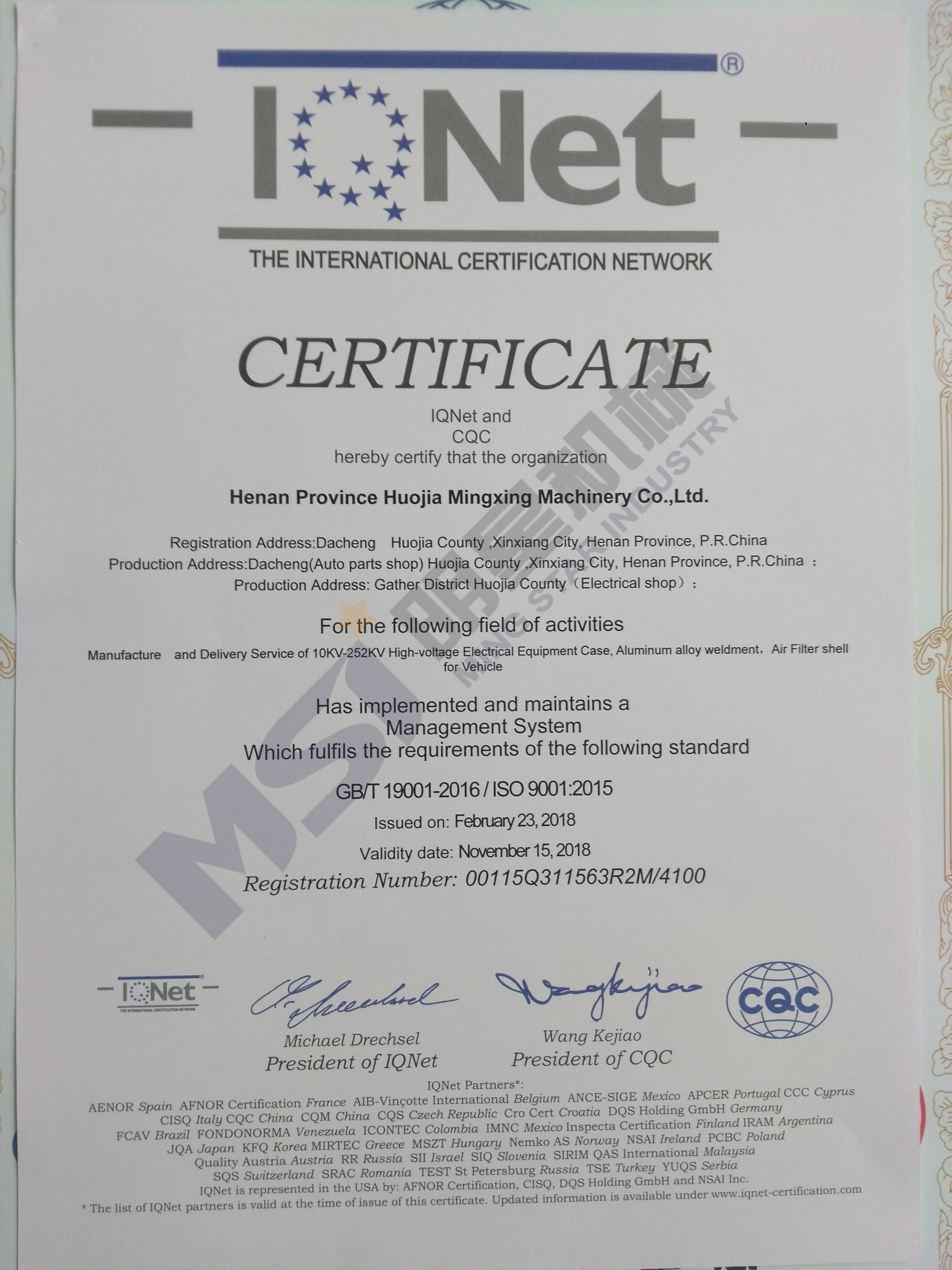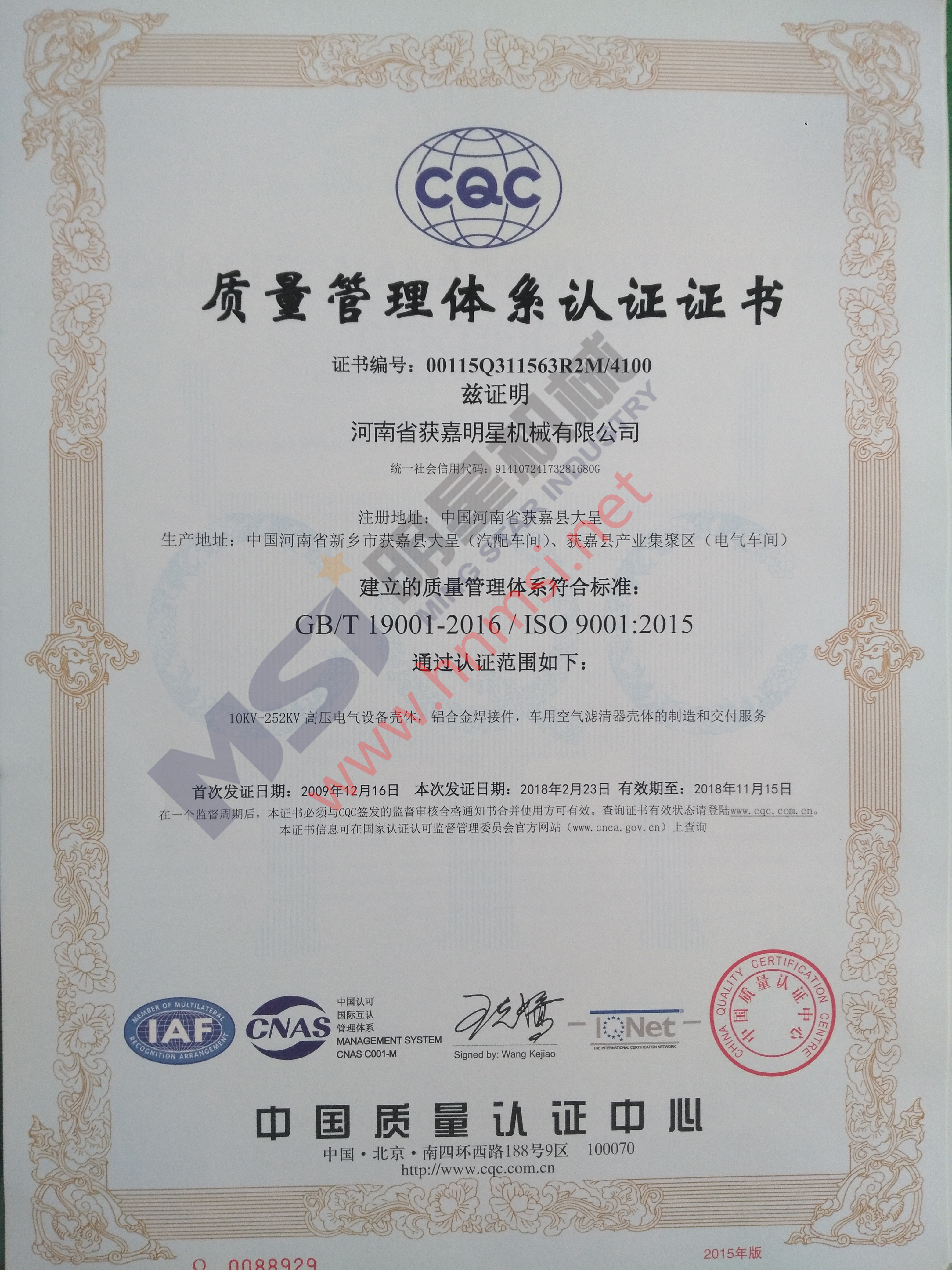 日前,經(jīng)過中國(guó)質(zhì)量認(rèn)證中心**、嚴(yán)格、細(xì)致的審核,明星機(jī)械質(zhì)量管理體系成功實(shí)現(xiàn)了由ISO9001:2008向ISO9001:2015的轉(zhuǎn)版審核。此次通過認(rèn)證的范圍是:高壓電氣設(shè)備殼體,鋁合金焊接件,濾清器殼體的制造和交付服務(wù)。